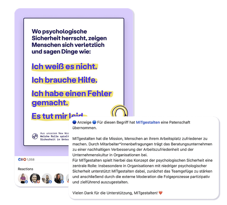 »Die New Work Glossar Patenschaft mit Neue Narrative hat uns zu mehr Sichtbarkeit und Glaubwürdigkeit im Thema Psychologische Sicherheit verholfen. Wir haben nach dem Social Media Post spannende Kontakte geknüpft und ein Momentum für das Thema geschaffen.«