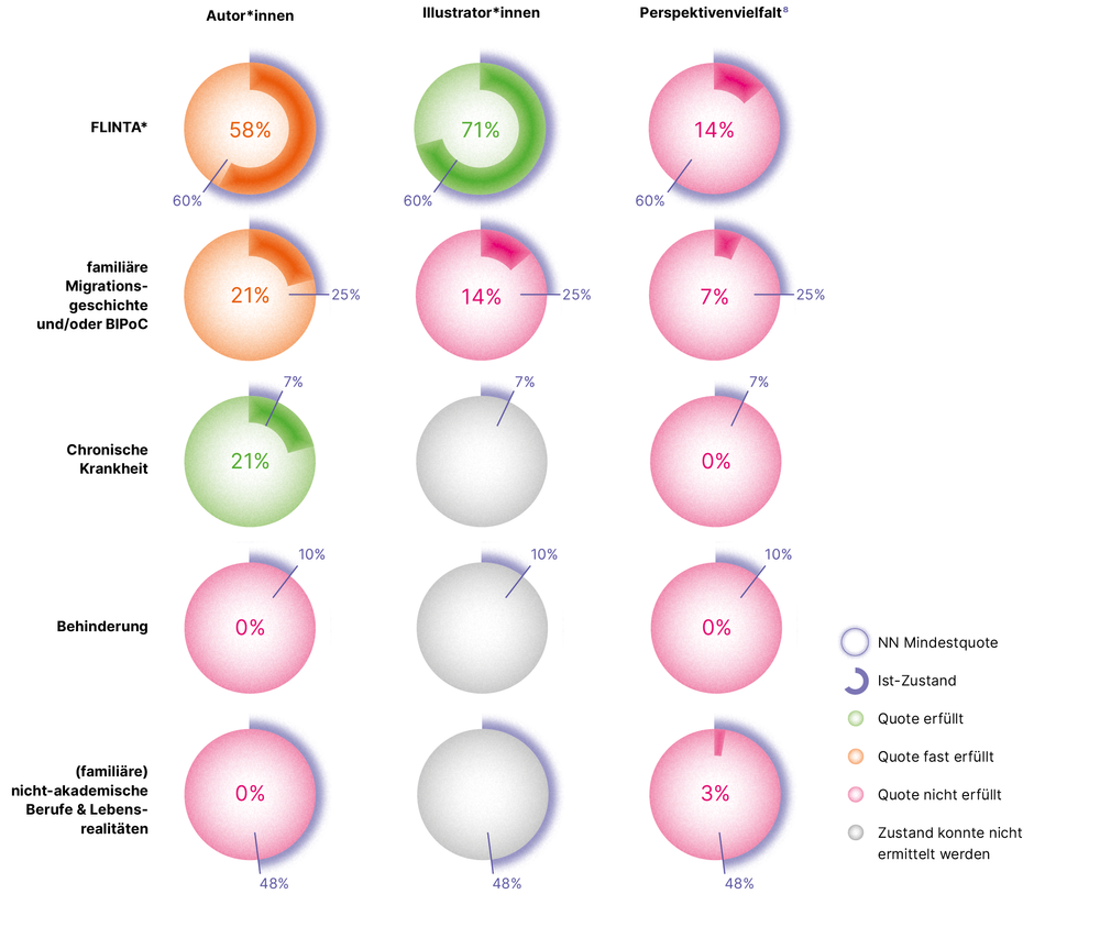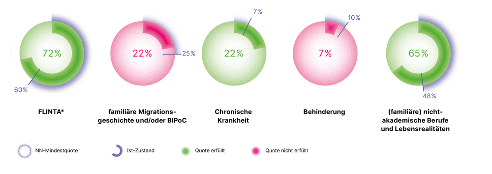 An einigen Stellen erfüllen wir die neue Quote, an anderen nicht ganz: Statt 25 Prozent der Mitarbeitenden haben nur 22 Prozent bei uns eine (familiäre) Migrationsgeschichte oder identifizieren sich als BIPoC, und statt 10 Prozent leben nur 7 Prozent unserer Mitarbeitenden mit Behinderung.1